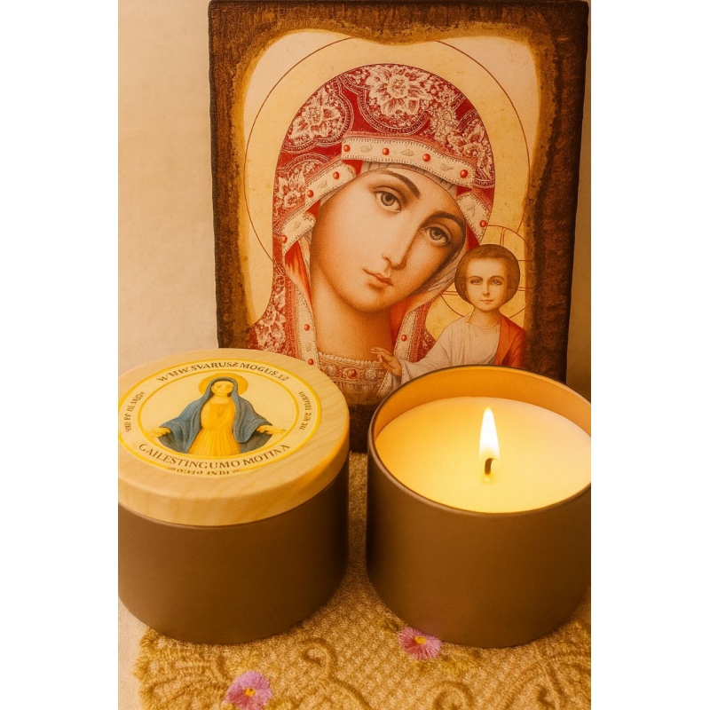 Iš šios žvakės sklindantis kvapas primins švelnų Gailestingumo Motinos Marijos prisilietimą...Švelnus rožių ir lotoso žiedų aromatas padės susikaupti ir prisiminti ją maldoje, meditacijoje ar tieisog norint širdimi prisiminti kas ESAME ir kur einame...